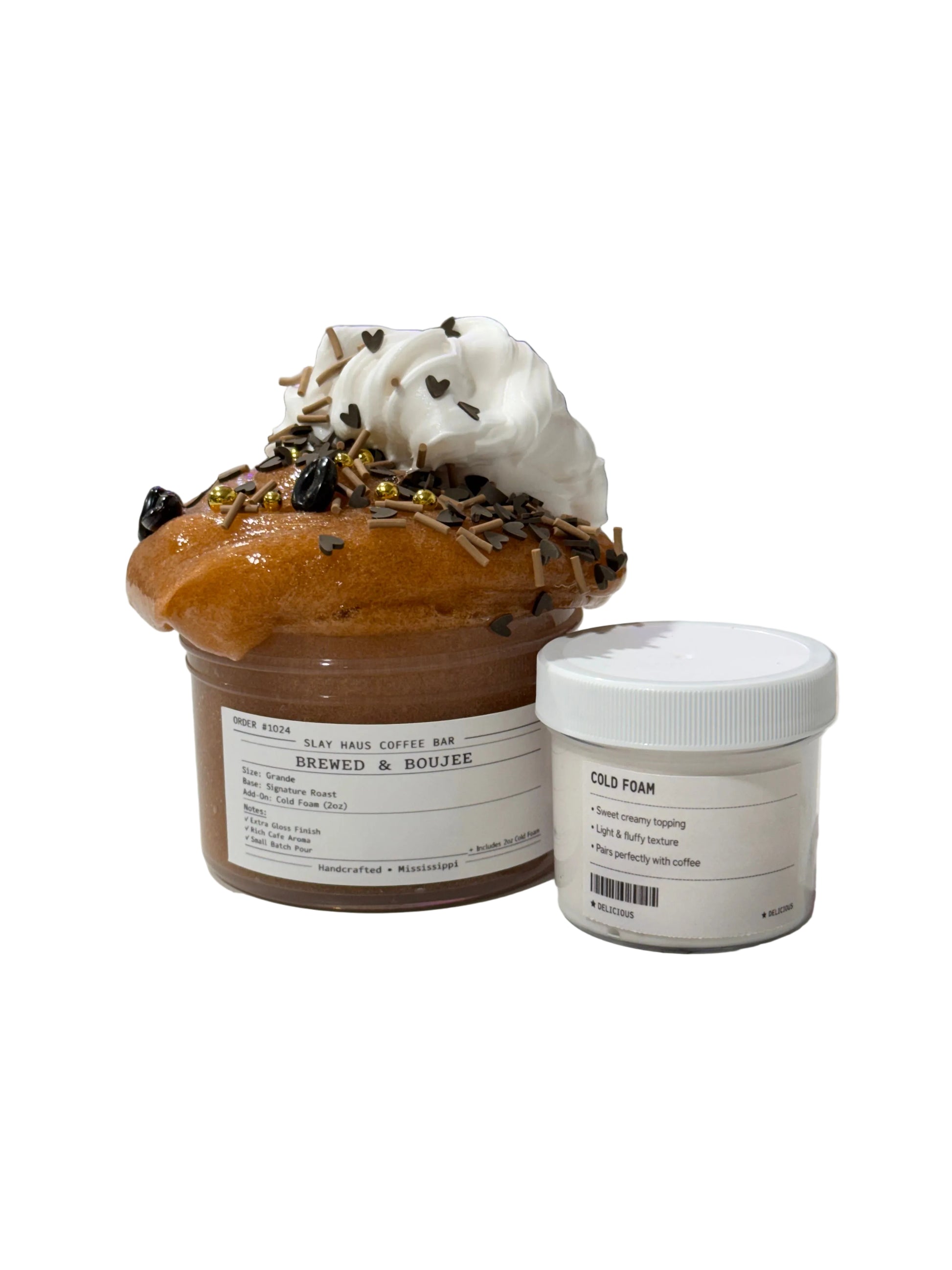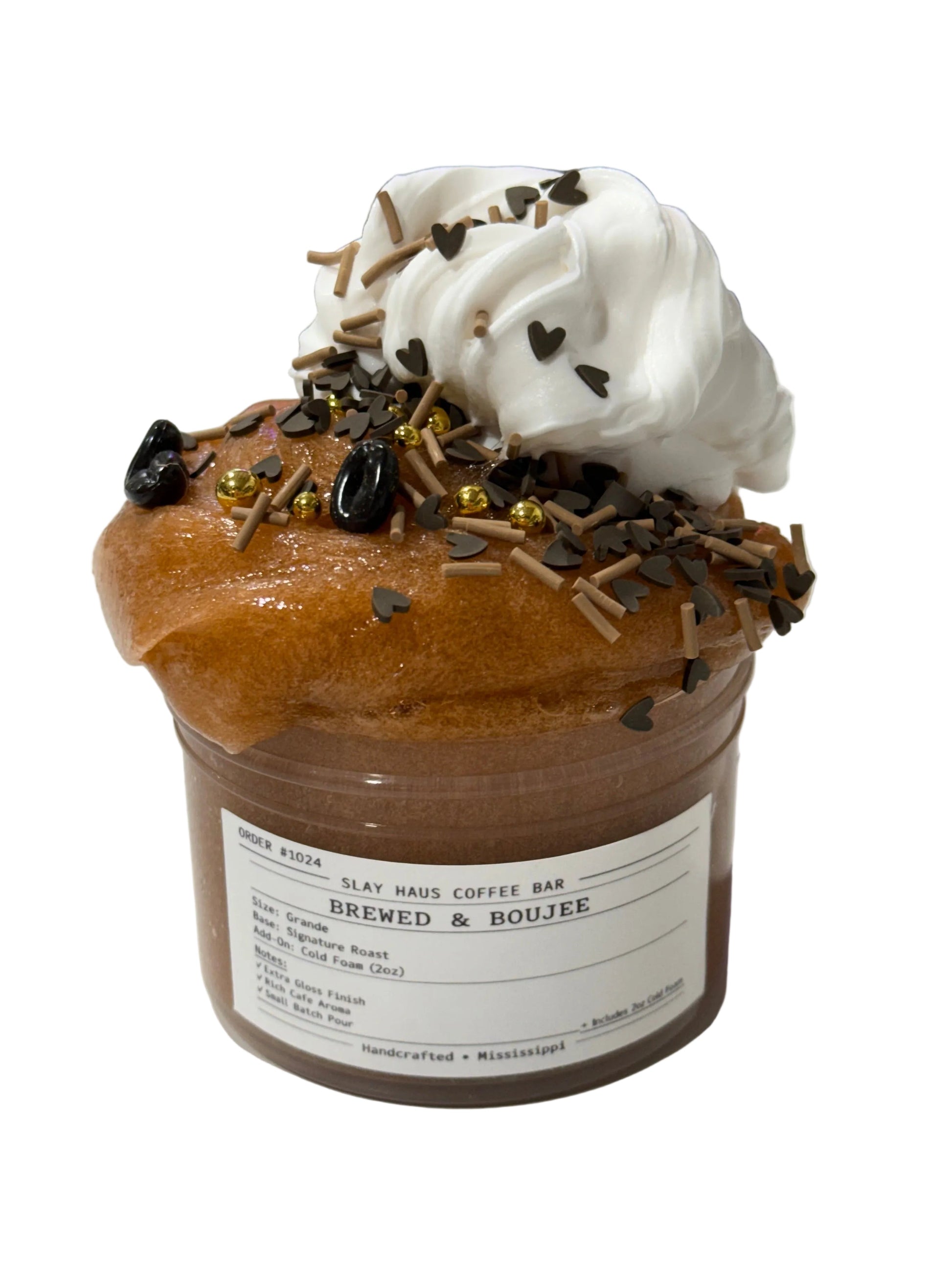A rich, coffee-tinted clear slime inspired by your favorite iced café drink. Glossy, stretchy, and perfectly clicky with a deep espresso scent that smells like fresh-brewed coffee. Comes with a 2oz cold foam topper to drizzle and swirl on top for the ultimate latte moment. Finished with the cutest brown and gold sprinkles, tiny brown hearts, and mini coffee bean fimos for that boujee coffee shop aesthetic.