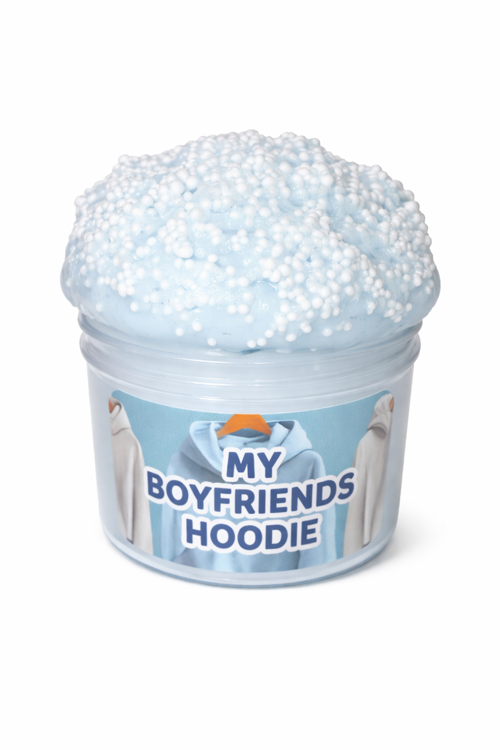 My Boyfriend’s Hoodie! This light blue slime is scented with an AVENTUS type fragrance, giving it a cozy and warm aroma that feels just like snuggling into your boyfriend's hoodie. The microfloam provides a massaging texture that's perfect for your hands. It's the cutest slime we have, offering a comforting and relaxing experience. Who wouldn't want to have the feeling of their boyfriend’s hoodie right in their hands?